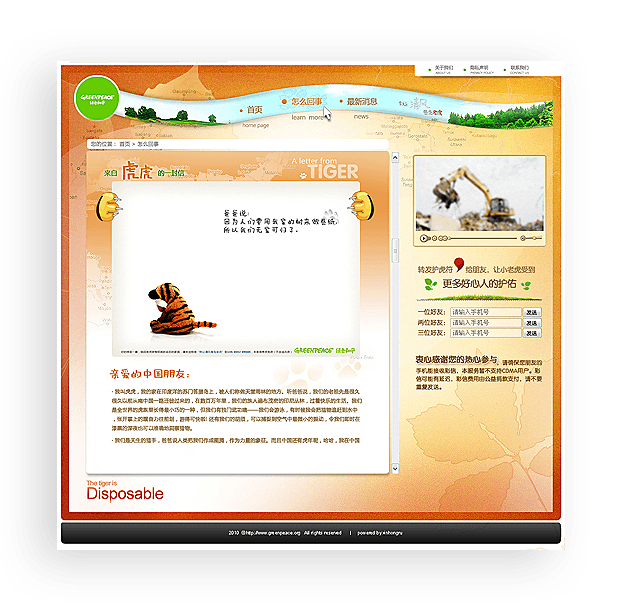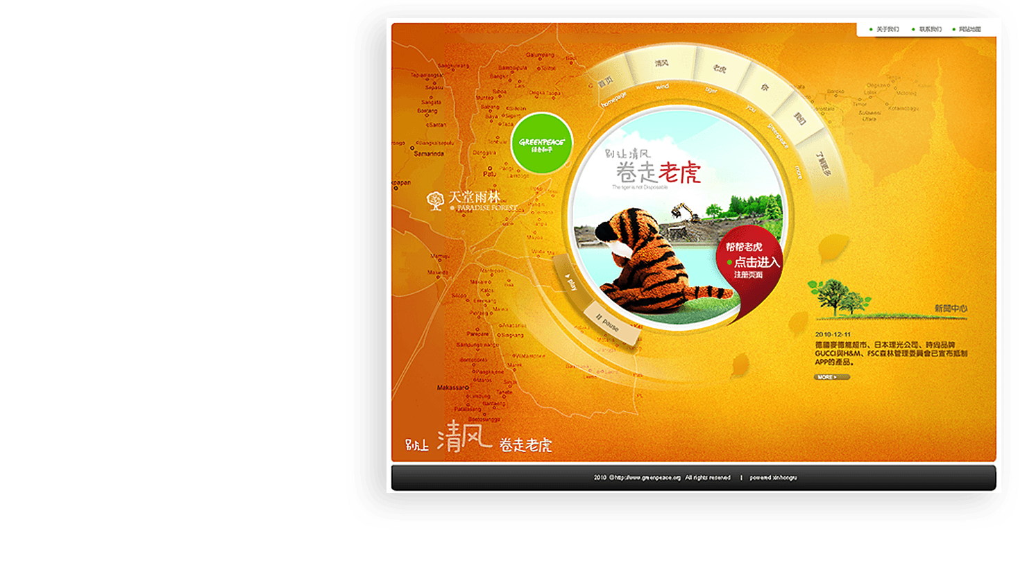 绿色和平网站举办《别让清风卷走老虎》等多个线上公益活动,吸引用户参与。kaiyun(中国)一站式服务平台长期负责其网站的维护和运营推广工作,保障网站稳定、有效运行。