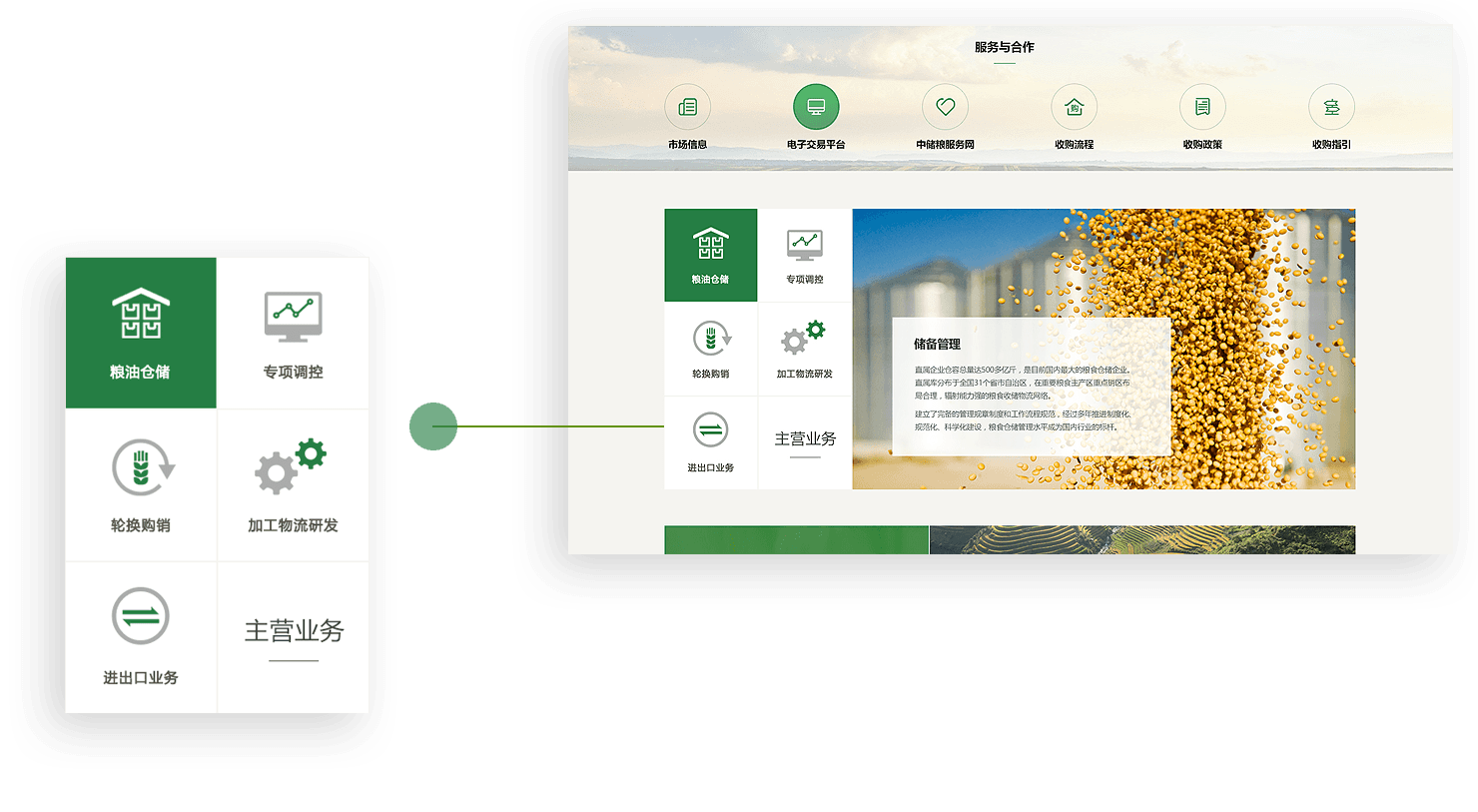 中储粮官网采用扁平化ICON的方式,集中展示储备管理、轮换购销、专项调控等多元业务,在保证用户便于阅读的基础上,通过创意、交互吸引用户关注。