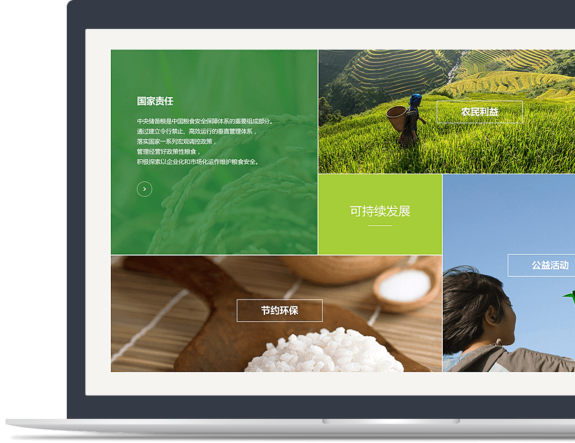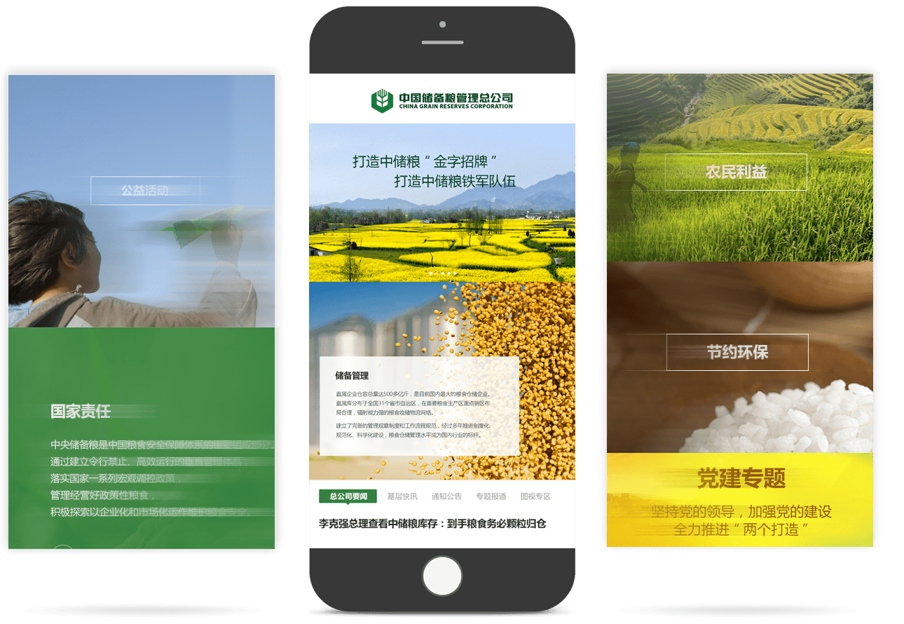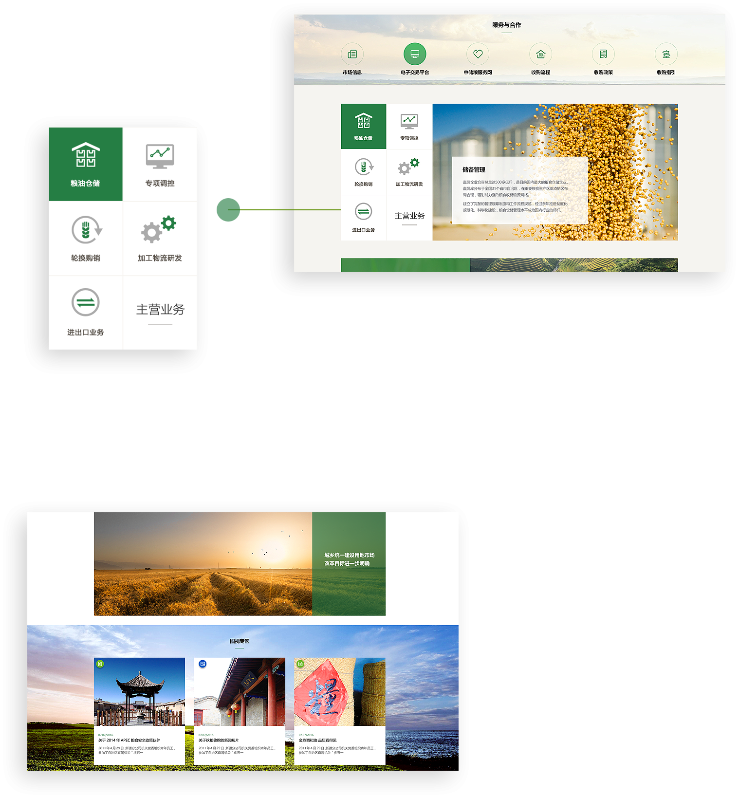 中储粮官网采用扁平化ICON的方式,集中展示储备管理、轮换购销、专项调控等多元业务,在保证用户便于阅读的基础上,通过创意、交互吸引用户关注。