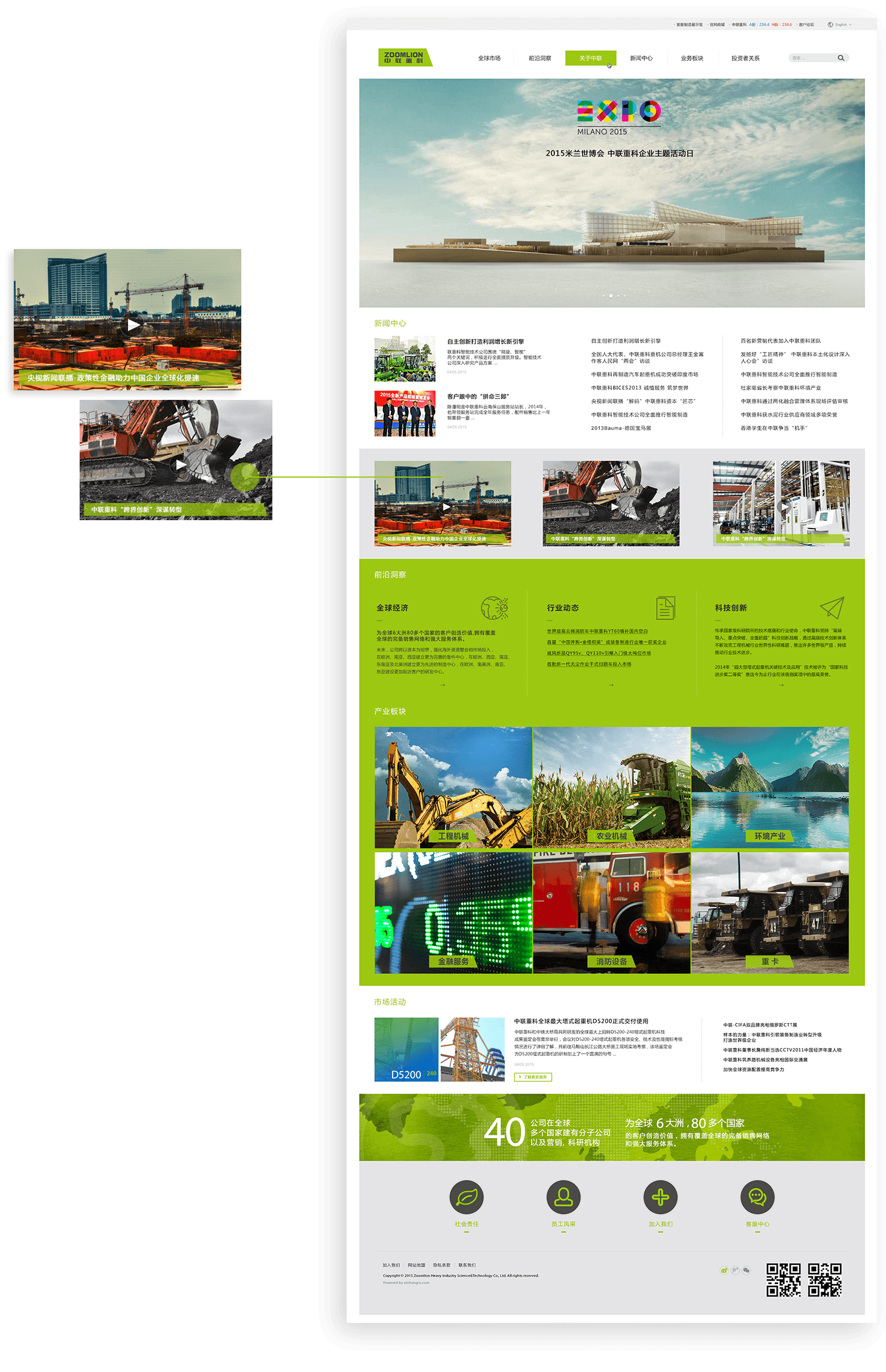 网站针对【关于中联】频道采用图片、文字、视频等多种元素结合的表现方式,塑造更加立体、多元、多维度的企业形象。